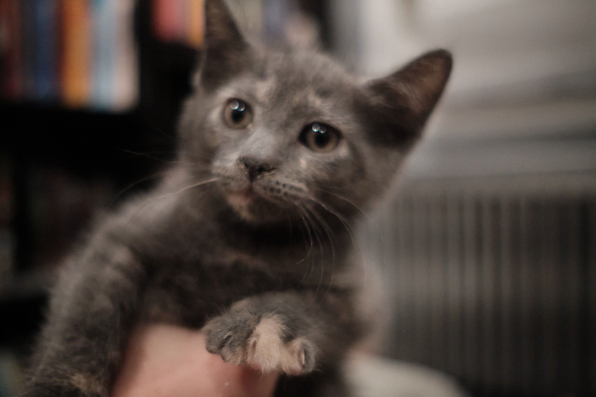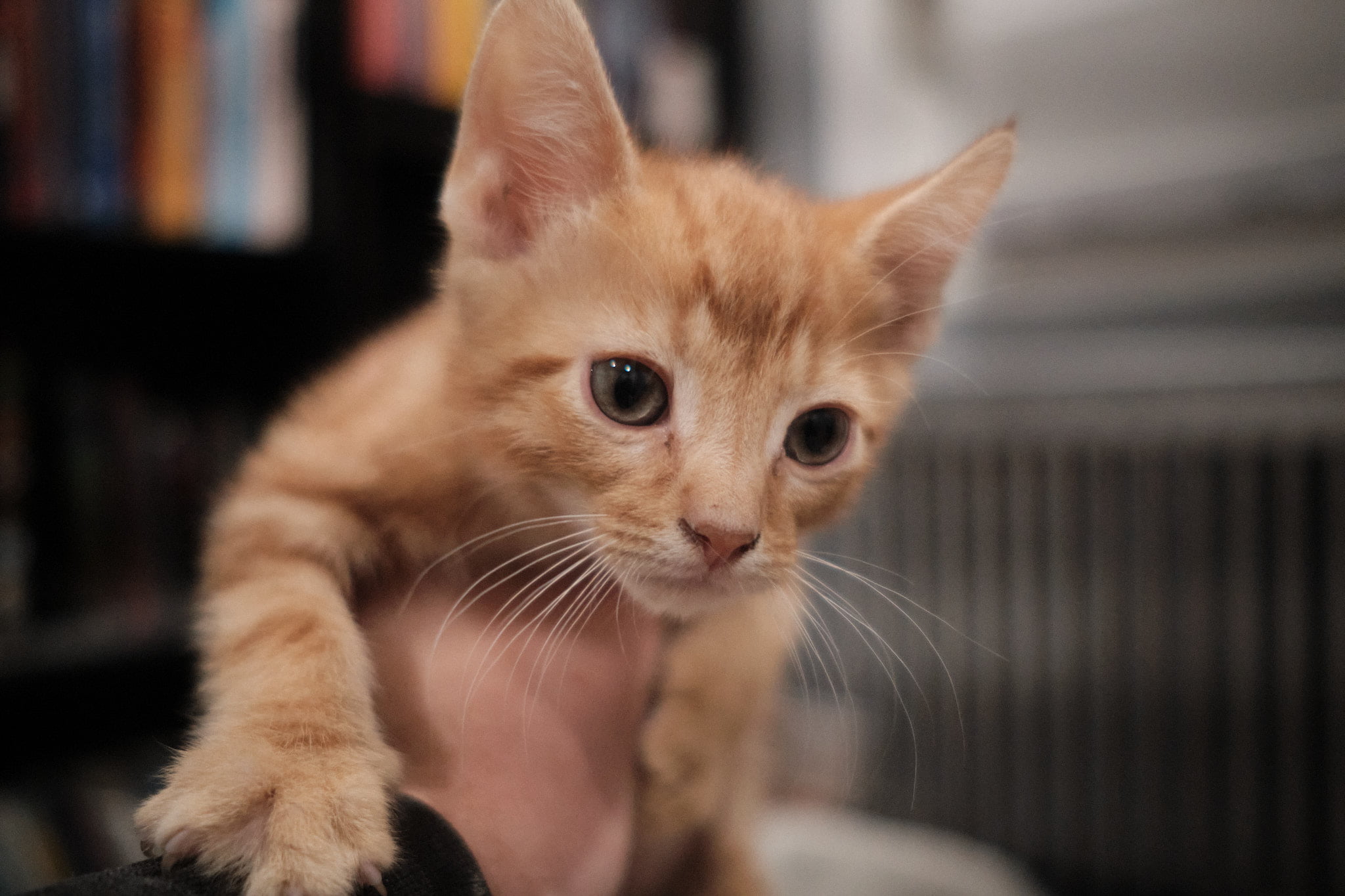 And so on and so forth. And so, after some investigation, I have updates to report. The little orange thing is the designated screamer. Nobody else even gets a chance because they wouldn't be able to hear themselves over the nameless orange thing. Orange seems to absolutely crave attention, and as soon as I came into the room started trying to play, loved being picked up, and ran towards me instead of away from me as some of the others did (looking at you, grey socks). I gave them food and scratches and took a few pictures that are hopefully better than the quick shots from yesterday. Can't wait to see them grow into whole entire cats with personalities and shit!