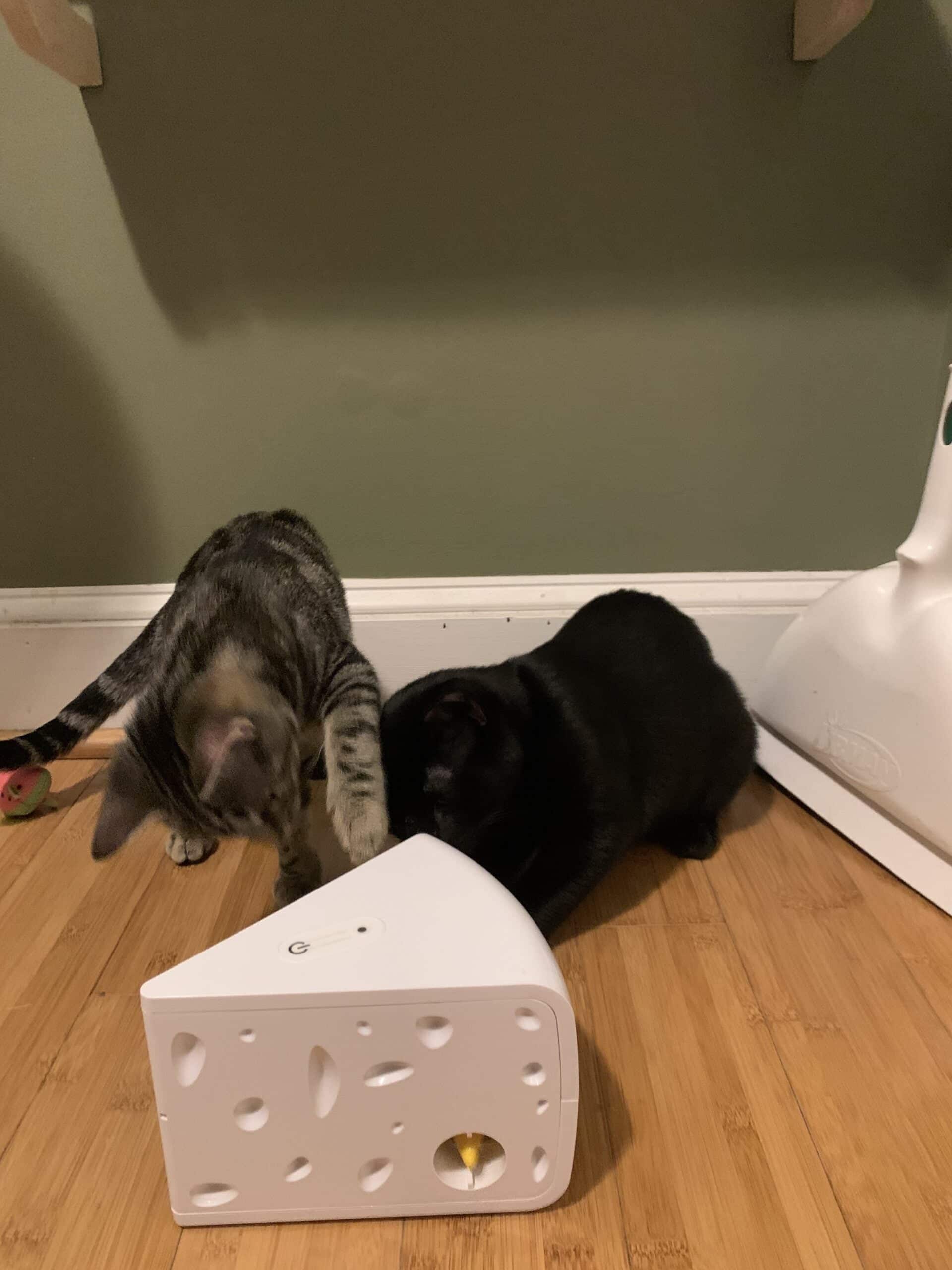 Meredith and Alex are settling in to their new home, especially thanks to the attentive care from their new pet parents Emma and Anthony. They astounded us by buying THE EXACT SAME BROOM that we have to clean up their litter as a welcome-home gift! Anthony was watching the live kitten cam late at night and noticed that these two always liked picking fights with the broom we kept in their room, and so he went out and bought the exact same model for them to always have and always fight with. Emma, for her part, found the mechanical cheese-block toy that they love and made sure to have one waiting for them at their new home as well. The level of care and attention these two have put into caring for their new friends is simply amazing. Can't wait to see these two grow up in such a loving home