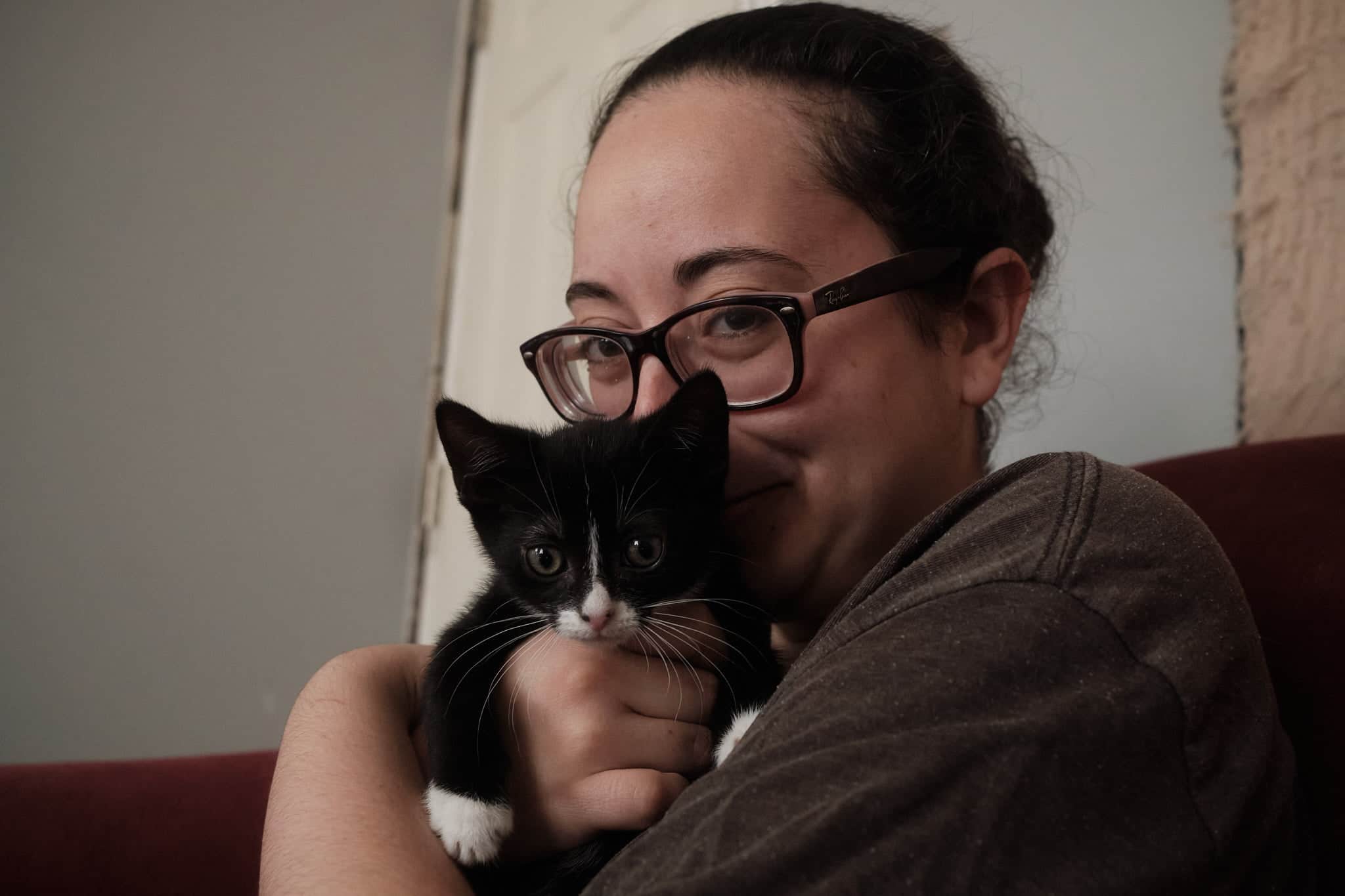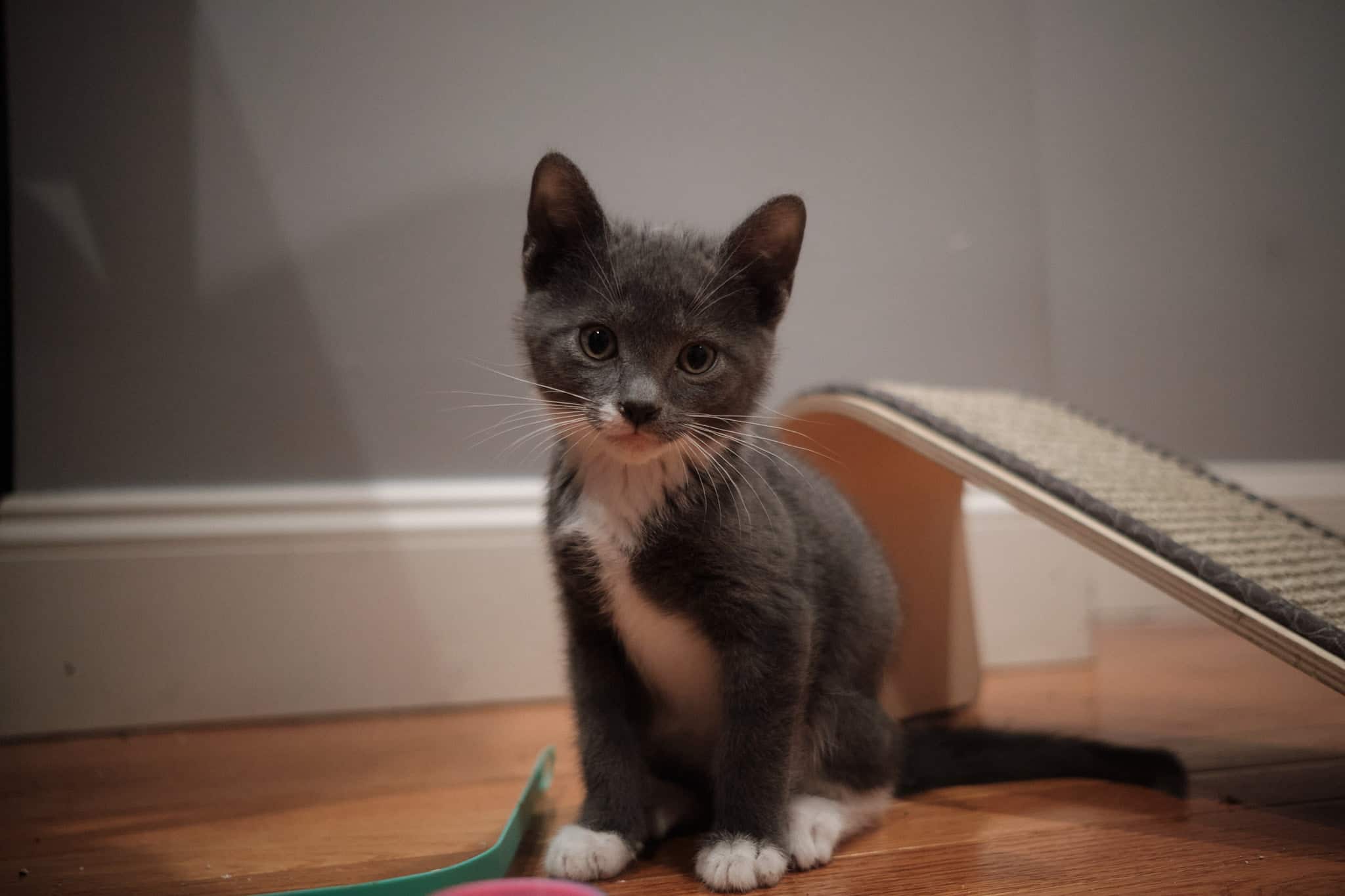 Gretchen, our tuxie, might deceive you with her adorable grompy face, but she's actually quite sweet. She's close with Teddy, and she's big into climbing.