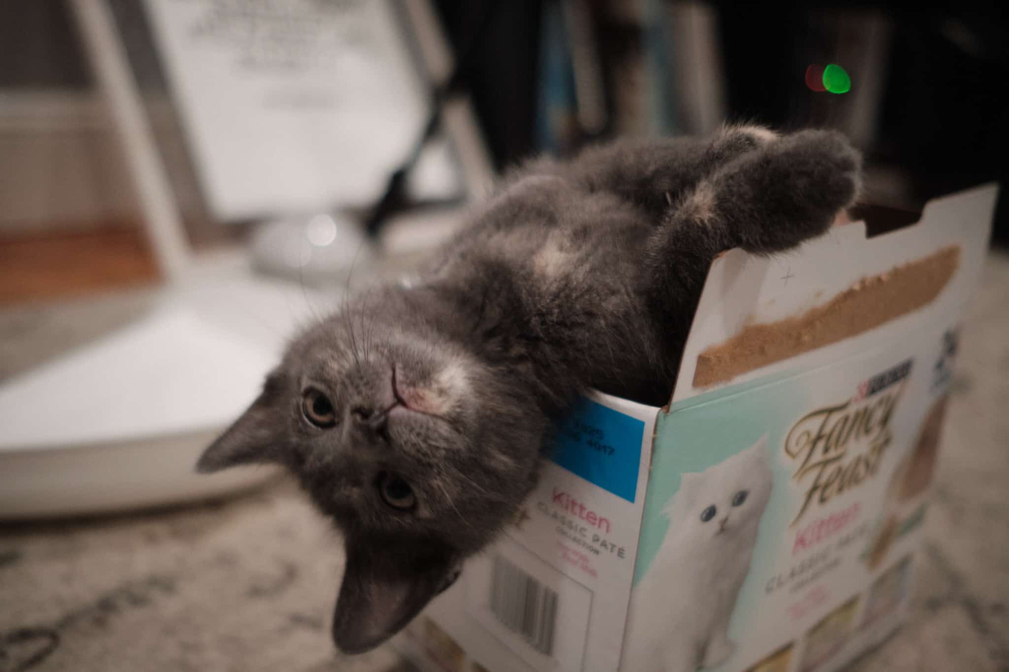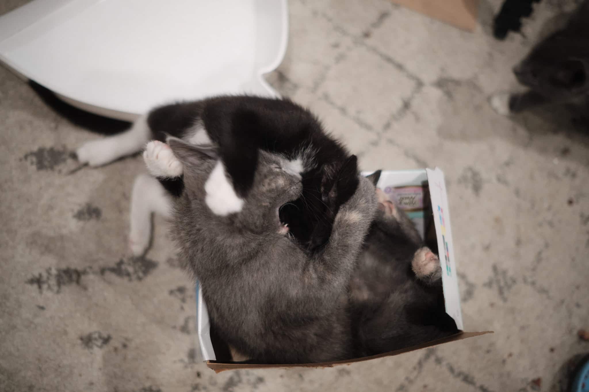 Regular-Sized Rudy, grey with socks, is a shy little guy. He loves playing with his siblings, but maybe not humans just yet (give him time). He HATES being picked up, but paradoxically LOVES being petted from tip to toe. He will yell and squirm and claw until you start stroking him and then he just goes limp and purrs.
